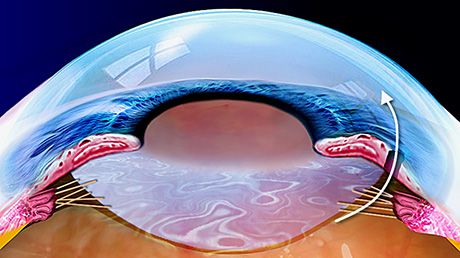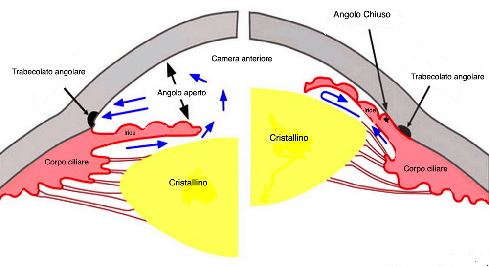 A seguito di particolarità anatomiche, spesso nelle ipermetropie elevate insieme con lo sviluppo della cataratta, l'anatomia delle strutture descritte si modifica così come mostrato nella metà destra dell'immagine 1, lo spazio tra iride e cristallino si riduce tanto che l'umore acqueo non riesce a trovare sfogo verso la camera anteriore, non può essere scaricato e la pressione endooculare cresce in maniera drammatica ed improvvisa, dando luogo ai sintomi citati.